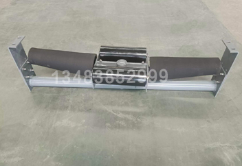雙中輥調(diào)偏托輥組回轉(zhuǎn)軸焊在下橫梁上,回轉(zhuǎn)總成(包括組合軸承、回轉(zhuǎn)軸套)安裝在下橫梁上方,回轉(zhuǎn)總成外圍設(shè)計(jì)了可擺動的中托輥橫梁,以回轉(zhuǎn)軸為中心,在運(yùn)行膠帶前、后中托輥橫梁上各設(shè)置一個中托輥,形成以回轉(zhuǎn)軸為中心的平衡支撐。側(cè)托輥采用加大軸承和軸徑設(shè)計(jì),用側(cè)托輥軸代替常規(guī)的側(cè)托輥橫梁功能。側(cè)托輥可拆卸的安裝在兩中輥中間。側(cè)托輥為錐形輥設(shè)計(jì),錐形輥采用鑄橡膠結(jié)構(gòu),其在膠帶跑偏時能產(chǎn)生較大的回向阻尼效果,從而使膠帶居中平穩(wěn)運(yùn)行。